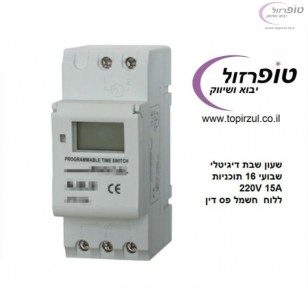 - שעון דיגיטלי שבועי 16 תוכניות 230V 15A ללוח חשמל להתקנה על פס DIN